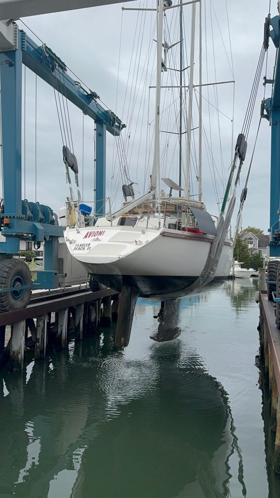 The marina we went to for haul out let us go in the night before and stay at the fuel dock. The next day they towed us into the well from our slip. We had never seen this service before and were quite happy it existed. Sharp turns and narrow wells are always a little stressful! Once in the well Avion went for a fly! We spent about a week on the hard going to quite painstaking measures to oversee the jobs and make sure the bottom job was done correctly. The marina side of things was excellent but the boatyard side, not so much. I have seen multiple boaters haul out their boat and then just leave while the bottom job is being done. They must know and really trust the facility doing the work because if we had done that, we would’ve ended up with a very sloppy job! We have learnt our lesson now and will only go to boatyards that come highly recommended.