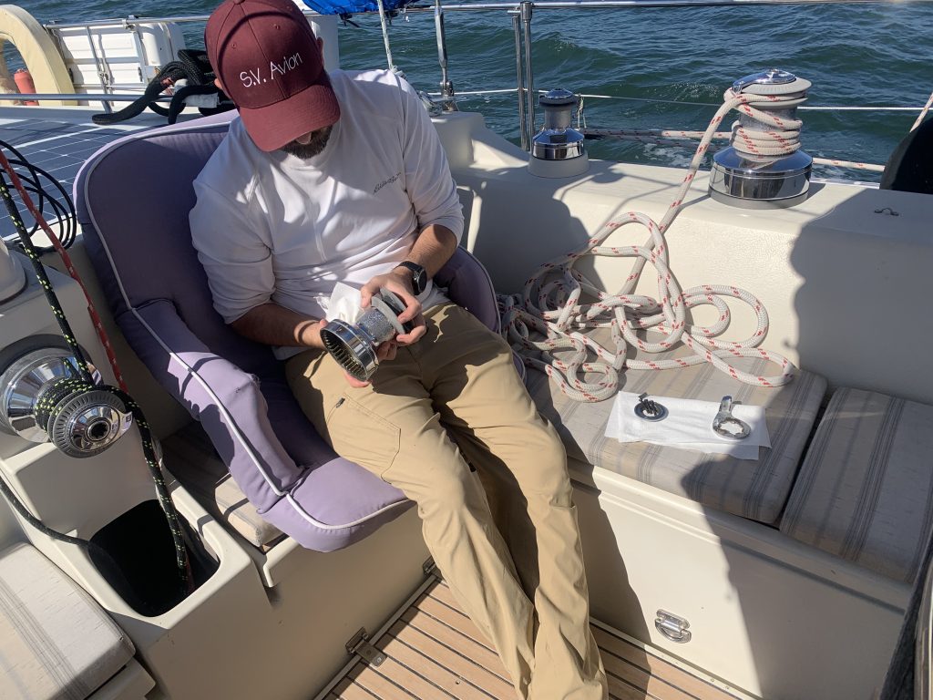 Since the job took longer than expected, we were a little overexcited to get going and get the sails out again. On the way up, a stripper ring had broken in the winch for our mizzen sheet and the replacement arrived the day we left. Rather than stick around and replace it at the marina like normal people, we were in a hurry to get going and Kevin decided he was going to attempt it underway. Well, he got it done…but seeing him struggle to keep everything together while we were bobbing about was certainly entertaining.