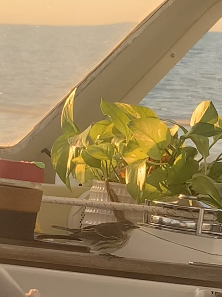 We had a little bird join us on the way to Cuttyhunk. It would come into the cockpit and hang out by the plant and nibble up bugs and then go away. It didn’t seem particularly scared of us. After we rode the Nor’Easter out in New Bedford we decided that was our sign to start heading south. Off we headed out to sea for the first time in a while and when offshore we discovered we still had our stowaway on board. The little guy kept us company all the way to the Delaware.